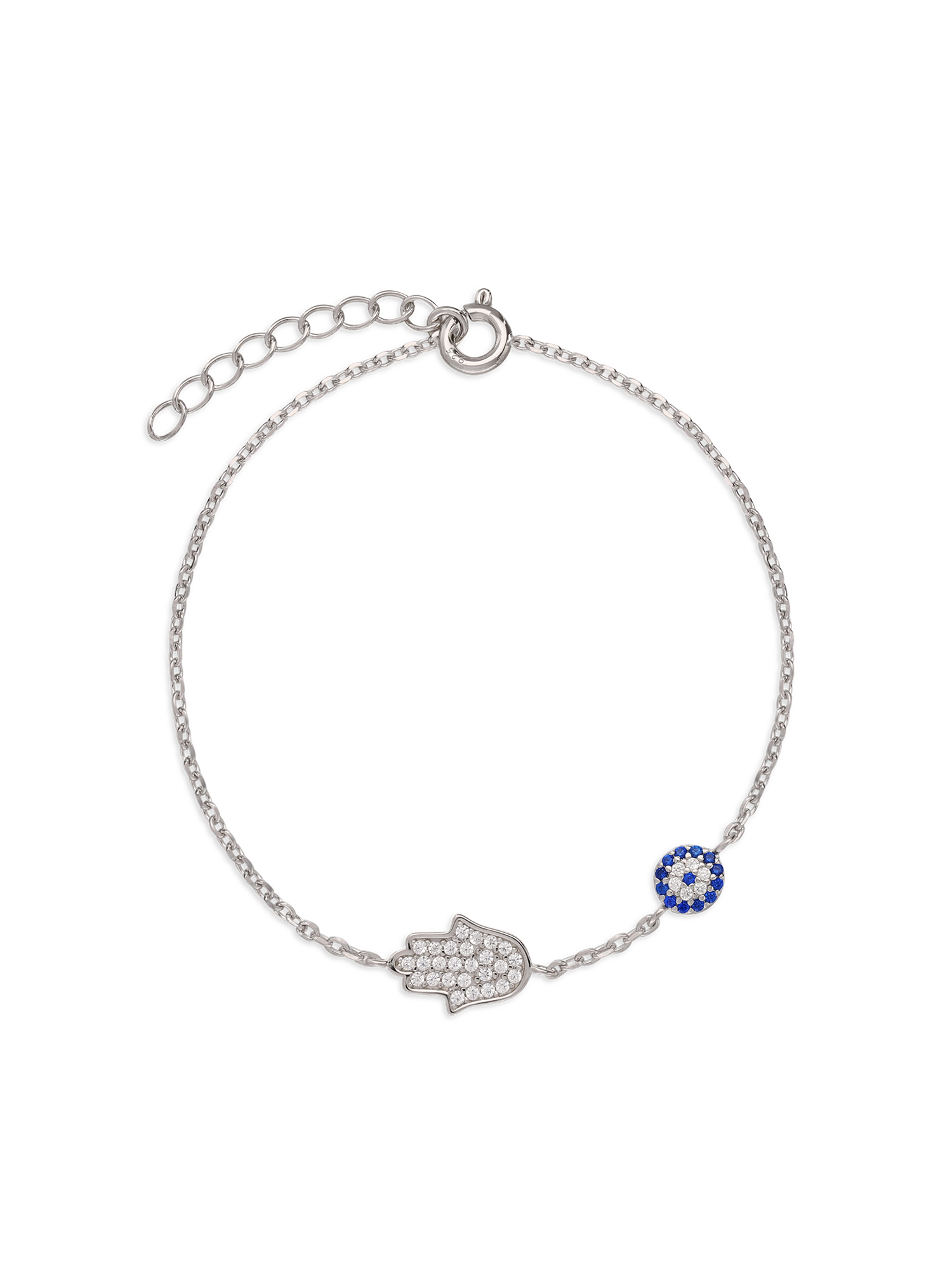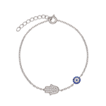 Pulseras Delicadas, Plata 925 bañada en rodio, Zirconia cúbica artificial, Azul, Claro, Hamsa, Círculo, Artificial, Color plateado, 1.86 g