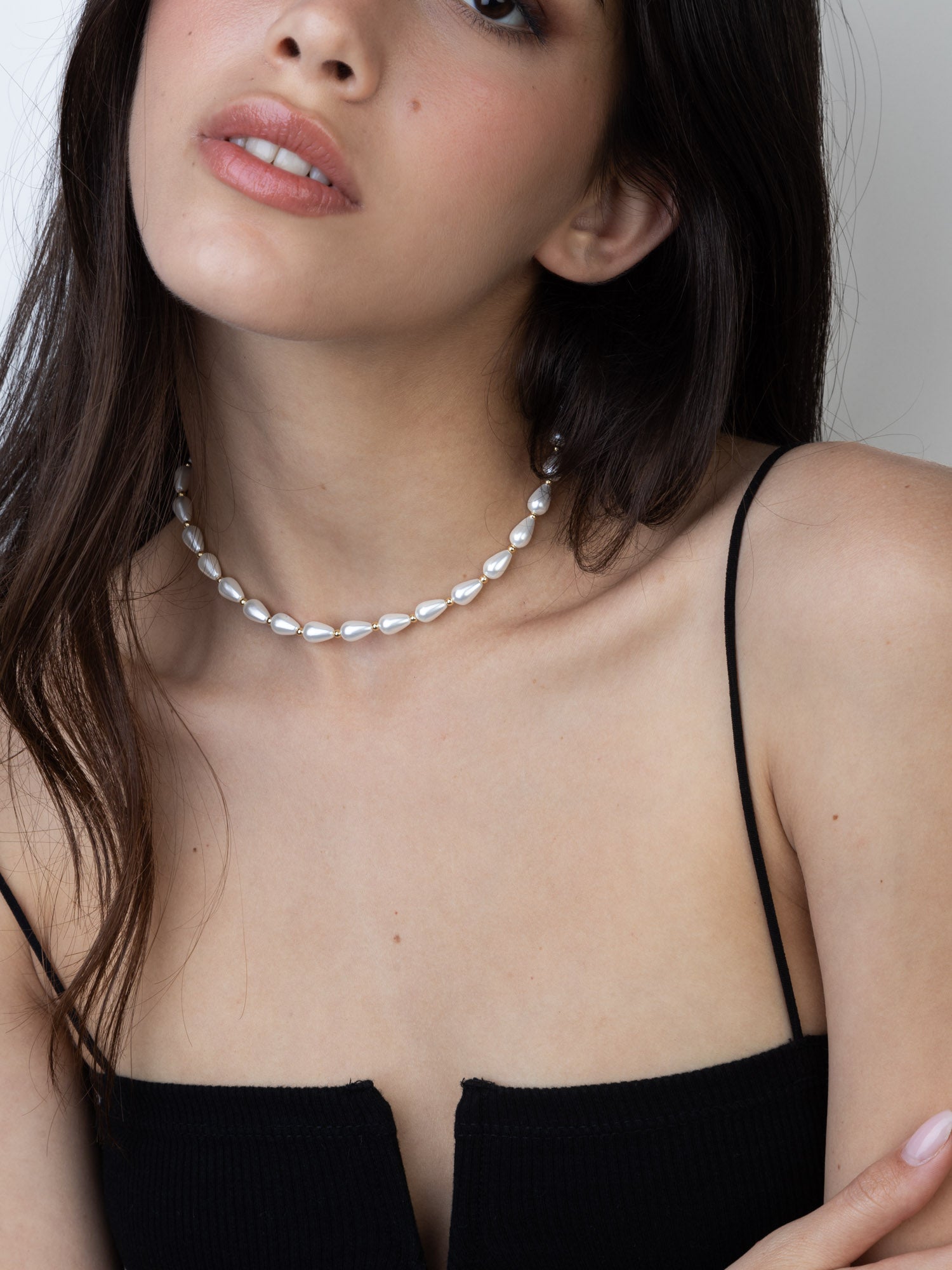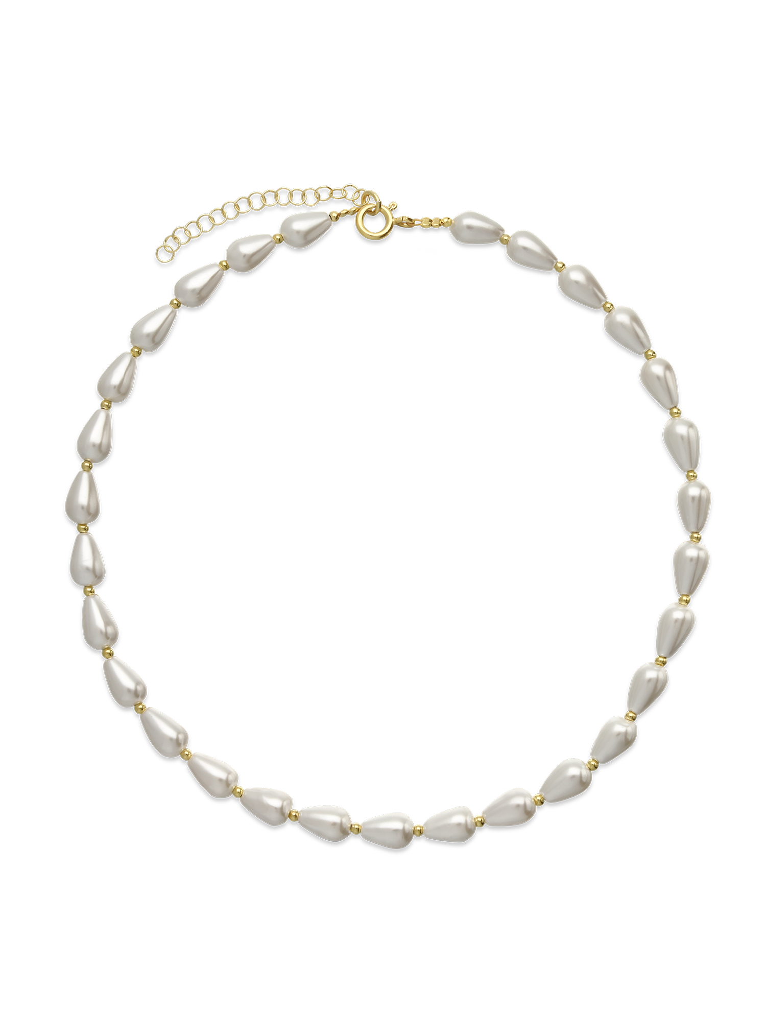 Collar gargantilla, Bañado en oro, Madreperla artificial, Blanco, Lágrima, Artificial, Color dorado, 16.10 g