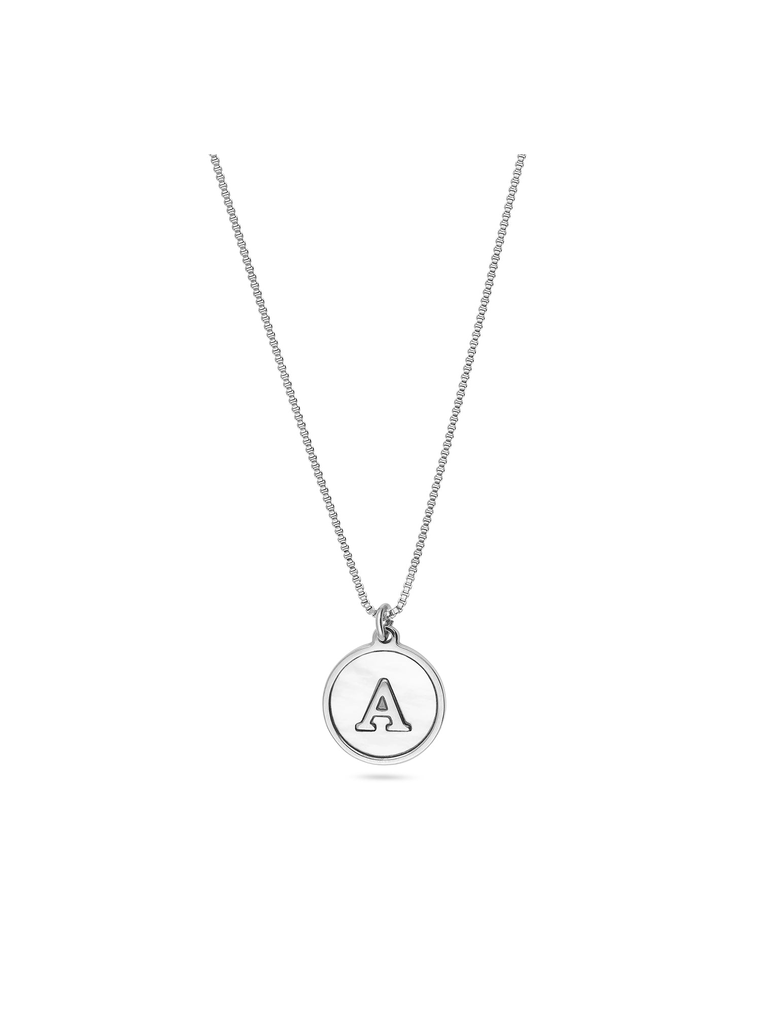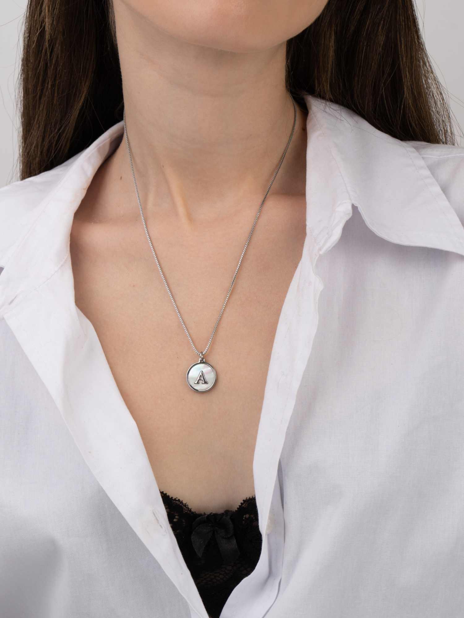 Collar colgante, Acero inoxidable, Madreperla artificial, Blanco, Círculo, Letra, Artificial, Color plateado, longitud del colgante: 1.5 cm, ancho colgante: 1.5 cm, 5.90 g