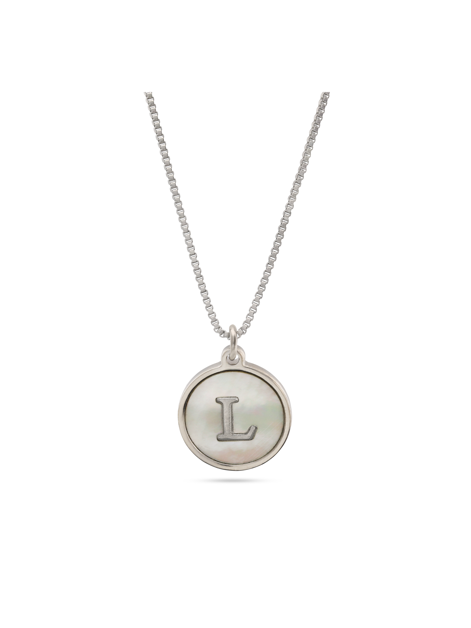 Collar colgante, Acero inoxidable, Madreperla artificial, Blanco, Círculo, Letra, Artificial, Color plateado, longitud del colgante: 1.5 cm, ancho colgante: 1.5 cm, 5.90 g