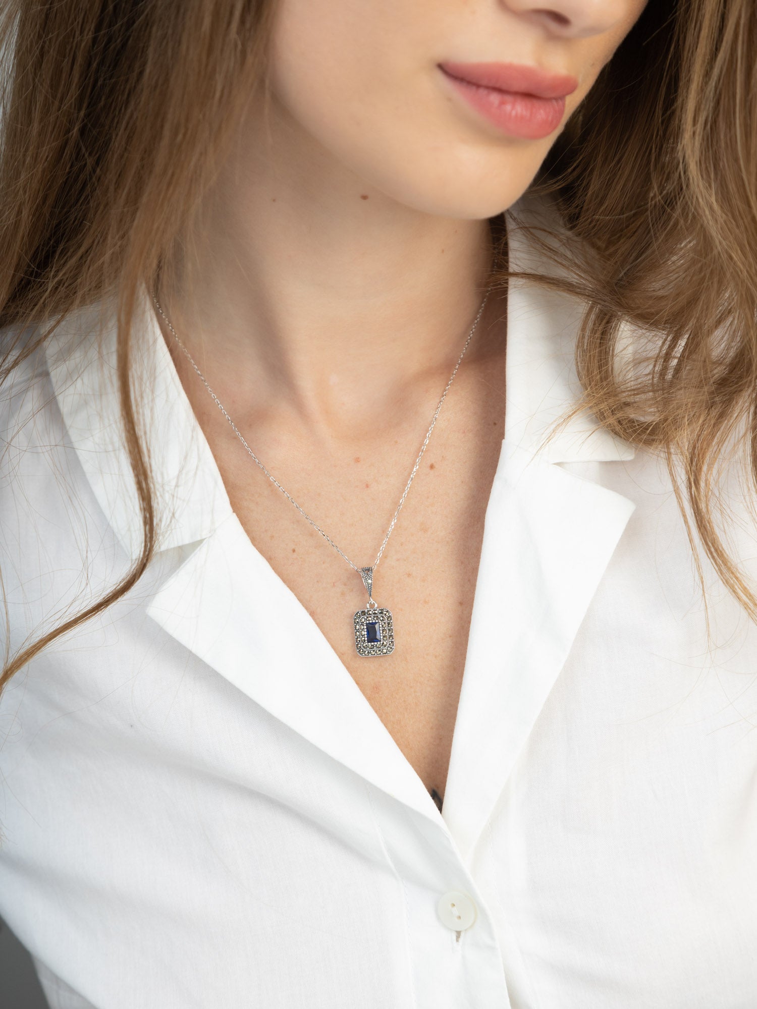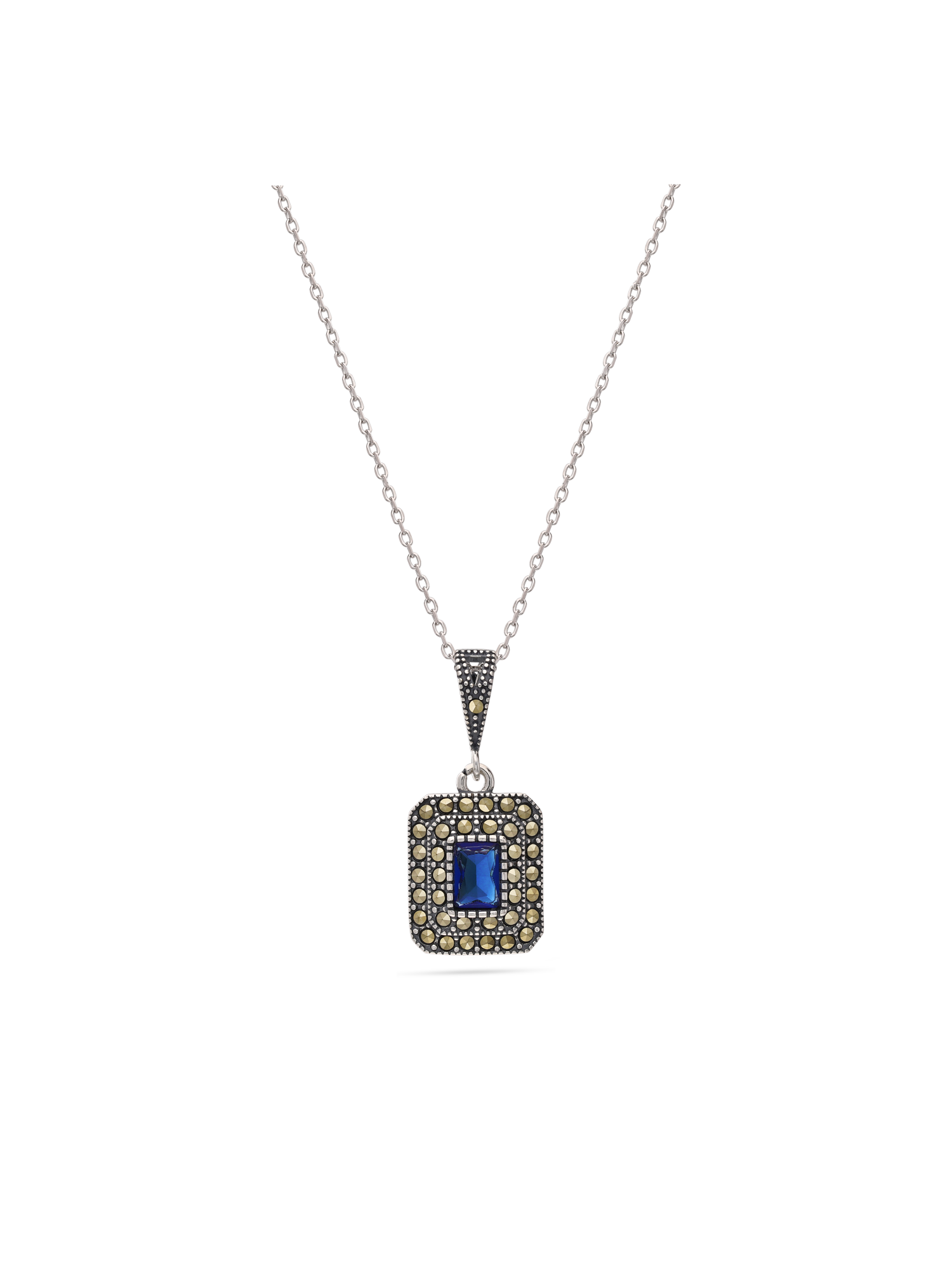 Collar colgante, Plata 925 bañada en rodio, Zirconia cúbica artificial, Marcasita artificial, Gris, Azul, Cuadrado, Artificial, Color plateado, longitud del colgante: 3.0 cm, ancho colgante: 1.3 cm, 3.70 g