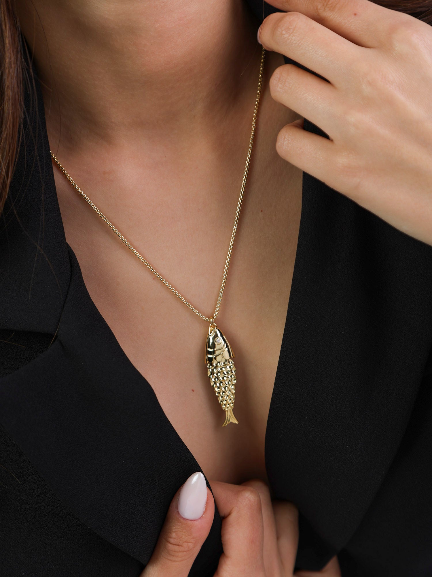 Collar colgante, Bañado en oro, Zirconia cúbica artificial, Claro, Pez, Artificial, Color dorado, longitud del colgante: 5.0 cm, ancho colgante: 1.4 cm, 15.11 g